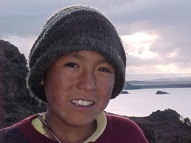 After dinner we convened with the rest of the tour group in the town square, and followed our guide as he led us up the path (click here) to the highest point on the mountain to talk about the native Andean spirituality and watch the sun set. He instructed us not to take photographs of the local children, or we'd be forced to pay them some money, thus somehow spoiling either the children or the local economy - I never did figure out which. It didn't stop me, of course (click here). We got some gorgeous views of Lake Titicaca at the summit (click here and here).